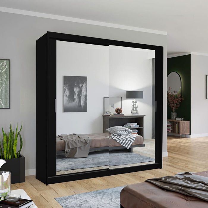 Elevate your bedroom’s style and functionality with the Chicago Mirror Sliding Door Wardrobe. Designed for contemporary living, this wardrobe boasts a sleek black finish and mirrored sliding doors that reflect light, making your room feel more spacious and inviting.