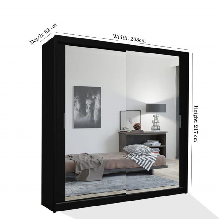 Add a touch of sophistication to your bedroom with the Chicago Mirror Sliding Door Wardrobe, featuring a bold black exterior and sleek mirrored doors. Measuring 203cm, this wardrobe is designed to offer ample storage space while saving floor space with its sliding door mechanism. Its modern look and efficient design make it a perfect addition to any home.