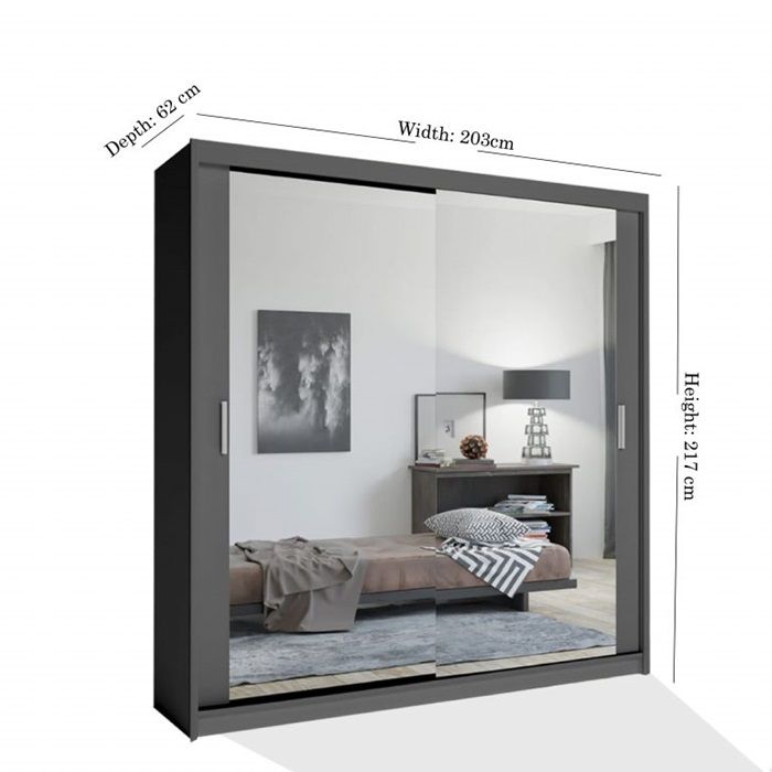 Add a touch of sophistication to your bedroom with the Chicago Mirror Sliding Door Wardrobe, featuring a bold grey exterior and sleek mirrored doors. Measuring 203cm, this wardrobe is designed to offer ample storage space while saving floor space with its sliding door mechanism. Its modern look and efficient design make it a perfect addition to any home.