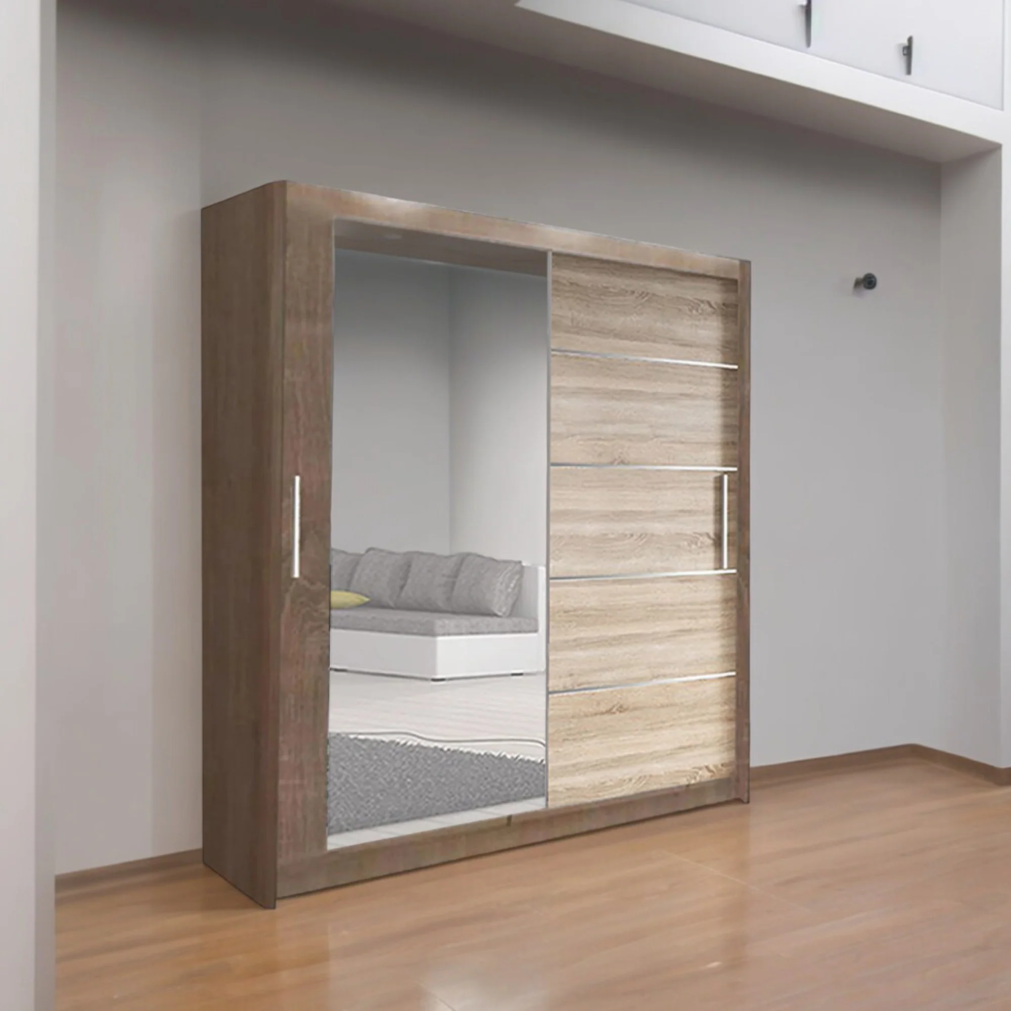 Enhance your bedroom with the timeless elegance of the Lyon Mirrored Bedroom Sliding Door Wardrobe. Designed to provide style and practicality, this wardrobe is an excellent solution for organized and clutter-free living. Its sliding doors save space and make it an ideal choice for rooms of all sizes. The integrated full-length mirrors not only add a touch of sophistication but also create an illusion of spaciousness.